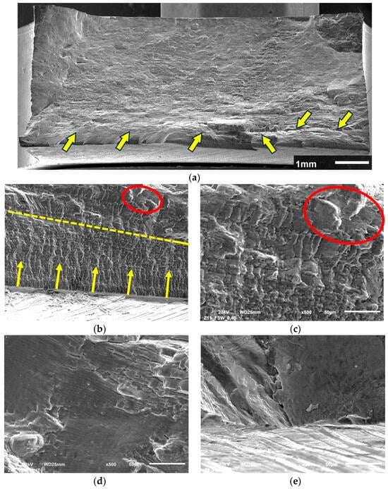 Fracture surface of the shot-peened FSW joint of a sample subjected to LCF tests at εac = 0.4%; overall view (a), faster crack growth zone (b,c), secondary cracks (d), very high crack propagation zone (e); description in text.