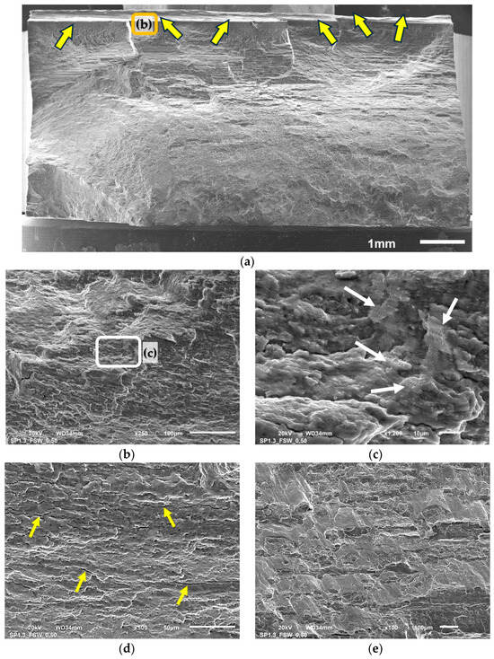 In Figure 9b the near-to-surface crack zone can be observed as the crack propagates slowly until it has reached the yellow dashed line. The crack propagation rate then accelerated after exceeding it. In this zone, the fatigue striations can be observed, which are circled in red (Figure 9b,c). Exemplary fatigue striations observed in the high-crack-propagation-rate zone are shown in Figure 9d. What is more, there were also secondary cracks courses observed, which, in the case of high loading rate, is related to surface line defects (Figure 9e). Similarly, a localized net of secondary cracks was also reported by Trško et al. in fatigue testing of shot-peened AA7075 []. Shot peening did not influence the nature of crack initiation because, similarly to not-shot-peened samples, the cracks were initiated simultaneously in many places (Figure 10a). The regions of stable fatigue crack growth are indicated with the arrows. The selected region is shown in Figure 10b,c and analyzed in detail.