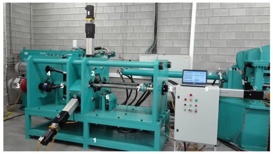 29]. It consisted of a support frame (1), mill stand (2), drive unit (3), power transmission system (4), billet support (5) and finished product support units (6), jaw chuck unit (7), and axial cylinder unit (8). The test stand was equipped with a measuring system and numerical control (9). The latter was based on the PAC controller for controlling the drivers of individual electro-screw actuators, i.e., 3 radial (working tools) and 1 axial (jaw chuck). The HMI panel was provided via a portable computer. It allowed for ongoing analysis of the rolling mill parameters during the forming process and was used to upload a program defining actuator motion. It was necessary to upload a file with the specified envelope of the final product. Dedicated software was used to convert it to a command line in the form of G-code, which was already an execution file. As a result, the operation of the tapered rollers and the jaw chuck could be synchronized.