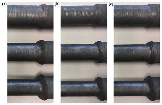 This study demonstrated that an increase in the forming angle α caused an increase in the material roughness Ra. In effect, the external surface quality of products was reduced. In addition to that, the use of a higher tool angle θ relative to the rolling axis led to an increased surface roughness of the C60 steel samples. The use of a low axial velocity Vu of the jaw chuck (10 mm/s) resulted in higher values of the roughness parameter Ra. With increasing the velocity, the roughness decreased. A similar relationship was observed when the reduction ratio δ was changed. An increase in the reduction ratio value (up to 1.53) led to a higher surface quality of produced parts.