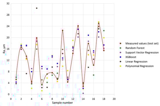 Ra roughness parameter of the steel samples. Based on previous studies, the following models were selected: linear and polynomial regressors, random forest regressor, support vector regression, and XGBoost. The first four were taken from the scikit-learn library [