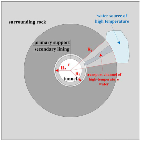 Assuming the tunnel is circular and only conducts heat radially along the tunnel, simplify Equation (2) to obtain the one-dimensional heat conduction equation in the unsteady state as polar coordinates, as shown in Equation (3), where r is the radius and the other parameters are the same as above. Figure 1 shows a schematic of the tunnel structure with elevated-temperature water.
