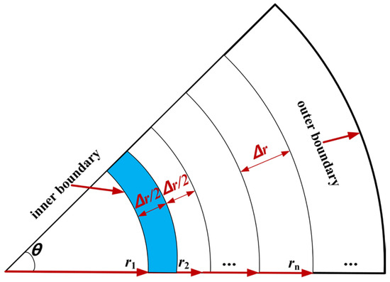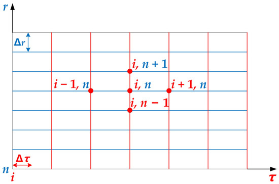 A finite number of sets of values at the discrete points are used to replace the continuous temperature fields in space and time. Then, through solving the algebraic equations established via a certain method regarding the above values, the values of the temperature to be calculated at the discrete points are finally obtained. The spatiotemporal zone of the unsteady temperature field can be discretized according to Figure 2. In Figure 2, r and τ represent spatial and temporal coordinates, respectively. Further, Δr and Δτ refer to spatial and temporal steps, respectively. Moreover, (n, i) represents the node position in the spatiotemporal zone, the temperature of which can be denoted as .