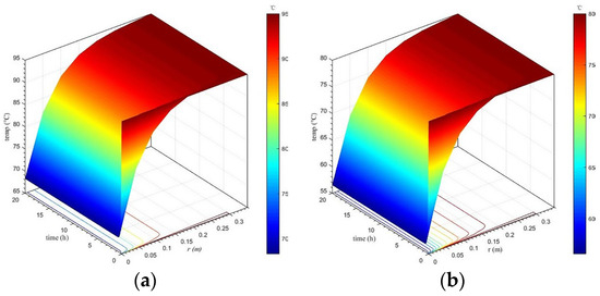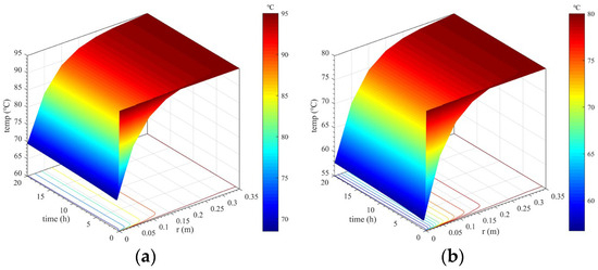 Substitute the calculation parameters in Table 3 with the derived discrete equations for the lining’s temperature field in the unsteady state in high-water-temperature tunnels, and use mathematical calculation software to program to calculate the spatiotemporal changes in the lining’s temperature field under each calculation condition.
