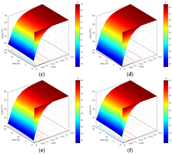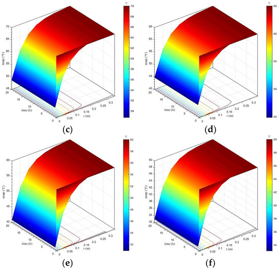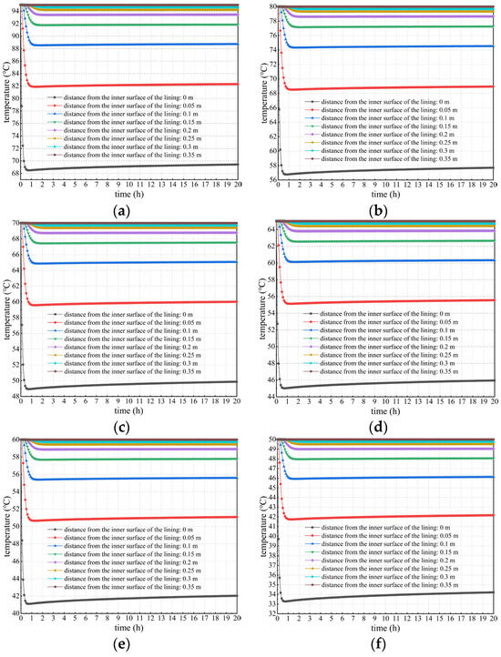 Spatiotemporal variation in the lining’s temperature field when not considering concrete hydration heat. (a) Touter = 95 °C; (b) Touter = 80 °C; (c) Touter = 70 °C; (d) Touter = 65 °C; (e) Touter = 60 °C; (f) Touter = 50 °C.