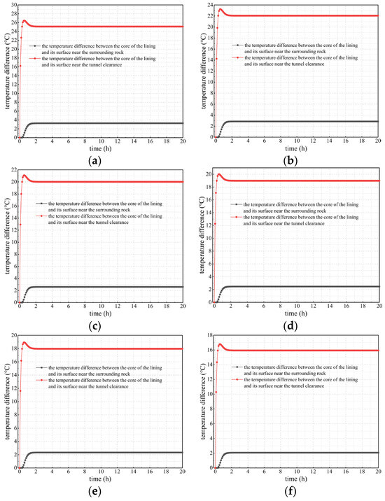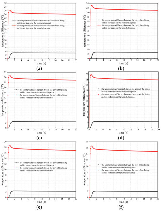 Figure 10 shows the curves of the temperature difference between the lining’s core and inner and outer surfaces under various calculation conditions when not considering concrete hydration heat. By comparing and analyzing Figure 7 and Figure 10, considering concrete hydration heat or not, the curves of the temperature difference mentioned above are similar under each calculation condition. The temperature difference between the lining’s core and outer surface is negatively correlated with the outer surface temperature of secondary lining, and it is maintained at 2–3 °C under each calculation condition. In addition, the temperature difference between the lining’s core and inner surface is positively correlated with the outer surface temperature of secondary lining. However, when not considering concrete hydration heat, the temperature difference between the lining’s core and surfaces basically stabilizes within 2 h after rising, and the curve showing the variation in the temperature difference after stabilization is a horizontal line. Obviously, this is different to when the temperature difference between the lining’s core and inner surface gradually decreases after a sharp increase of 2 h and reaches stability after approximately 20 h when considering hydration heat.