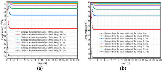 Figure 6 shows the curves of temperature versus time considering concrete hydration heat is plotted to specifically explore the spatiotemporal changes in the lining’s temperature field. Seen more intuitively and clearly from Figure 6, the temperature of secondary lining within a thickness of approximately 15 cm near the tunnel clearance decreases most sharply. The higher the temperature of the lining’s outer surface, the more drastically the temperature decreases. For example, when the temperature of the lining’s outer surface is 50 °C, the temperature at the lining’s inner surface decreases by approximately 15.8 °C after the temperature field reaches a stable level. However, when the outer surface temperature of secondary lining is 95 °C, its inner surface temperature decreases by approximately 25.6 °C after the temperature field reaches stability, which is approximately 62.0% more than that of 15.8 °C.