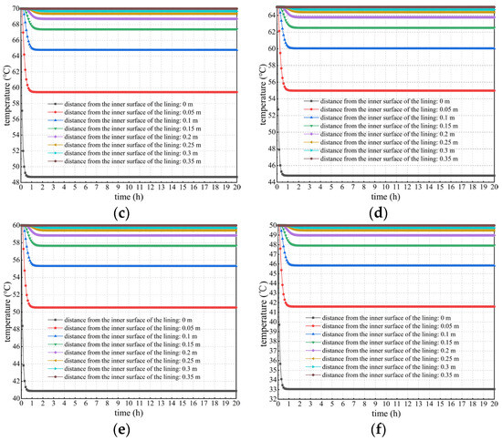 Changing curves of the lining temperature at different temperatures and positions when not considering concrete hydration heat. (a) Touter = 95 °C; (b) Touter = 80 °C; (c) Touter = 70 °C; (d) Touter = 65 °C; (e) Touter = 60 °C; (f) Touter = 50 °C.