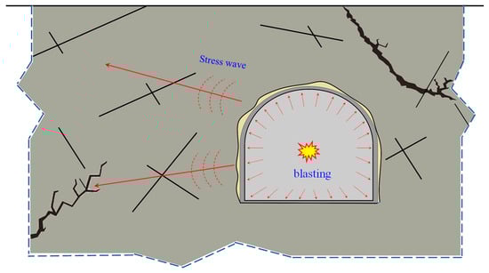 The drilling and blasting method [1,2] plays a crucial role in tunneling and underground mining operations, as it effectively governs rock fragmentation, ensuring construction safety and quality [3]. However, the blasting process can notably affect the fragmentation and fracture zones in deep and high-stress environments, which may differ significantly from those observed in conventional conditions. The propagation patterns of blast-induced cracks in multi-hole blasts are characterized by distinct features. The rock mass is characterized by a multitude of pre-existing fractures that have a significant impact on their stability, especially when subjected to high levels of stress. Many of these fractures are in a critically stable state when under controllable conditions. But, during blasting operations, shockwaves are generated, which initiate, expand, and create interconnected networks of fractures in the surrounding rock. Nearby fractures may undergo sudden expansion under stress wave disturbances, which may cause the overall instability of tunnels or underground structures. As such, this series of scenarios can be categorized into two parts: (1) the near-field fragmentation and penetration of porous cracks caused by borehole blasting; and (2) the initiation of surrounding rock fractures induced by stress waves, as depicted in Figure 1. As engineering projects delve deeper into the subsurface, these challenges become progressively more intricate and critical. They necessitate careful consideration in the realm of deep engineering construction.