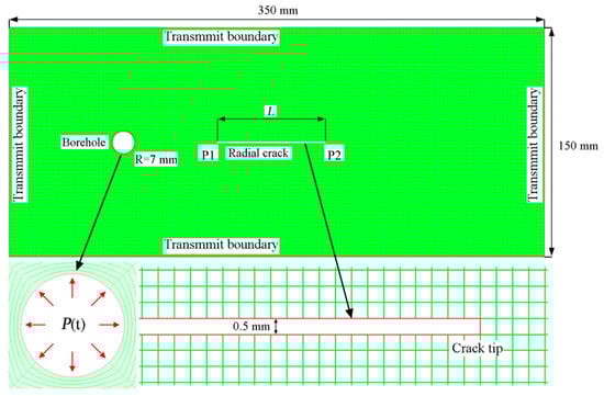 A numerical model was established in Ansys-AUTODYN code (version 19.2) to investigate the propagation of cracks induced by blast stress waves. The model comprised a rectangular plate measuring 350 mm in length and 150 mm in height. A 7 mm radius hole was designed to generate cylindrical waves. The distance from the hole center to both the left and top edges was 75 mm. On the right side, a radial crack ran along the horizontal symmetrical line of the model, with a length denoted as L. The model utilized a structured grid composed entirely of quadrilaterals. To ensure the accuracy of the computational results, the grid was evenly distributed throughout the entire model, consisting of 209,804 elements. The minimum element edge length was 0.4 mm and was located around the boreholes, while the remaining boundary element edges had a length of 0.5 mm, as shown in Figure 2.
