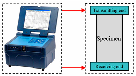 The dynamic parameters of the sandstone were measured using an acoustic velocimeter (RSM-SW, Wuhan, China), as depicted in Figure 3. The velocimeter consisted of two piezoelectric ceramic ends: the transmitting end, which generated wave signals, and the receiving end, which was responsible for signal reception. By analyzing the wave traveling time through the specimen and its geometry configuration, the velocities of the P-wave and S-wave could be accurately calculated.