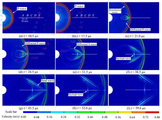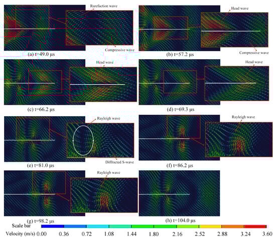 A compressive P-wave is evident in Figure 4a,b, accompanied by a rarefaction P-wave. When the P-wave encountered the left tip of the crack, it gave rise to a diffracted P-wave and diffracted S-wave, as shown in Figure 4c, with their wavefronts forming circles centered at the crack’s left tip. As the diffracted P-wave and S-wave traveled, their amplitudes gradually attenuated, leading to the observation of two wavefronts: a diffracted P-wave and diffracted S-wave, as depicted in Figure 4d,e, respectively. Additionally, apart from the diffracted P-wave and S-wave, two other types of waves were present. The first was the head wave, which represented the reflected S-wave as the P-wave propagated along the crack surface. The second was the Rayleigh wave, which traveled along the crack surface and induced significant displacement in the vertical direction.
