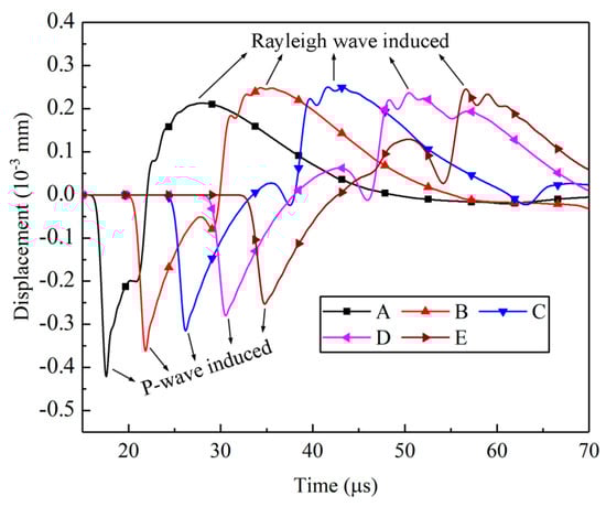 These waves were capable of instigating vibrations across the crack surface, each with distinct amplitudes. For a comprehensive analysis of the surface displacements, a set of five gauge points (A, B, C, D, and E) was strategically located at 10 mm intervals along the upper crack surface. These gauge points were instrumental in capturing the temporal evolution of displacements in the y-direction, as clearly depicted in Figure 5. Notably, the displacement history curves exhibit a discernible bifurcation into two distinct stages: negative and positive. During the negative stage, the displacements manifested as negative values, signifying a tendency for the crack to contract. This closure phenomenon was chiefly driven by the compressive pulse, particularly the P-wave, characterized by the highest propagation velocity. However, it is important to note that the attenuation of the P-wave induced a noticeable decline in the peak displacements of the five designated points (A, B, C, D, and E) within the negative stage. This diminution was particularly prominent with an increasing distance from the crack’s left tip.