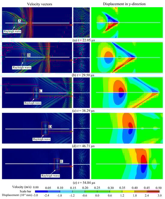 During the positive stage, the peak displacements at points A, B, C, D, and E in Figure 5 show minimal changes, which differ significantly from the negative stage induced by the P waves. Figure 6 displays the particle velocity vectors caused by the Rayleigh waves and the corresponding y-direction displacements at points A, B, C, D, and E. This observation suggests that the amplitude attenuation of the Rayleigh waves during their travel along the crack surface was minimal, which aligns with theoretical findings by Achenbach [8].