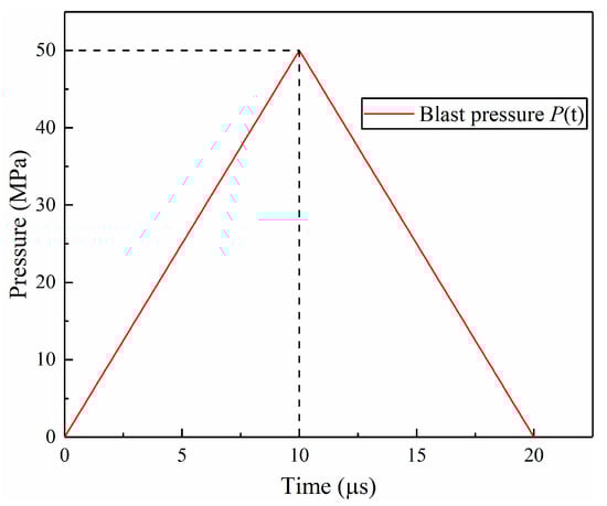 In the context of a solitary blasting event, the loading profile engendered by an electrical detonator can be approximated by a triangular curve, as illustrated in Figure 8. This triangular loading curve spans a duration of 20 µs, reaching a peak value of 50 MPa. Although there might exist minor deviations from the actual blast loading sequence, this approximation is advantageous, as it streamlines the calculation process and conveniently mitigates the impact of certain less influential variables.