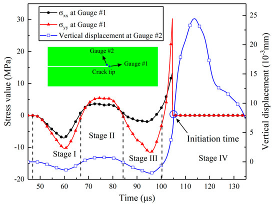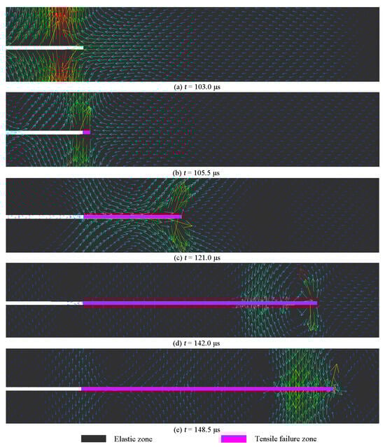 The model with a crack length of 110 mm was selected as an example to illustrate the influence of various waves in the crack initiation process. Figure 9 displays the particle velocity vectors near the crack at different moments. The P-wave, as the leading compressive pulse, possessed the highest traveling speed, as evident in Figure 8a,b. Observing the velocity vectors, it becomes apparent that the crack closed under compression. This phenomenon occurred because the crack surface was free, leading the particles on the surface to move outward when subjected to compression. This observation is supported by the displacement of gauge 2 at the crack tip in stage I, as shown in Figure 10.