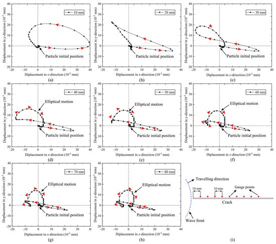 The Rayleigh wave, known to be a product of the diffracted P-wave and S-wave, induced elliptical motion of the particles near the crack surface, leading to a much more significant vertical displacement, as shown in Figure 10. Eight gauge points were strategically positioned along the crack’s upper surface at intervals of 10 mm to elucidate the formation of the Rayleigh wave in this study, as depicted in Figure 11i, to record the displacements in the x-direction and y-direction. The results presented in Figure 11 illustrate the particle trajectories along the crack face during wave grazing.