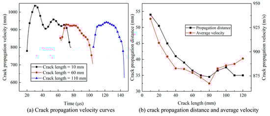 Three typical crack lengths (10 mm, 60 mm, and 110 mm) were selected to investigate the effect of crack length on the crack propagation behavior in detail, and their velocity functions versus time are plotted in Figure 13a. In the case of a 10 mm crack length, the crack velocities underwent an initial rapid augmentation, followed by a subsequent decline, temporary fluctuations, and finally, a rapid deceleration until crack arrest. This pattern was consistently observed across varying crack lengths: an initial velocity increase, followed by a phase of relatively stable velocities, culminating in a rapid deceleration leading to crack arrest. It is noteworthy that shorter crack lengths exhibited substantially elevated peak velocities, with the corresponding curves manifesting heightened vibration characteristics. These pronounced vibrations stemmed from intricate stress superpositions occurring at the advancing crack tip within such configurations. In contrast, longer crack lengths were predominantly influenced by the Rayleigh wave, which imparted consistent attributes to the velocity curves. Average velocities and propagation distances for models with different crack lengths were obtained to analyze the concrete influence of crack length on crack propagation, as shown in Figure 13b. Evidently, the propagation distances exhibited a gradual decay as the crack length increased, ultimately attaining a state of stabilization when the crack length achieved a certain extent. This characteristic was coupled with a corresponding trend in average velocities, wherein a gradual decline was evident in the initial stages. Notably, at a critical crack length of approximately 80 mm, the average velocity reached its nadir, plausibly attributed to the influence of the S-wave. As crack length continued to increase, the distinctive influences of the shear wave and Rayleigh wave came to the fore, culminating in a gradual elevation of the average crack velocity. This phenomenon underscores the growing prominence of these waves in shaping the behavior of crack propagation.