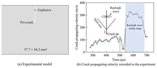 As the length of the crack increased, the Rayleigh wave became visible on the surface. By comparing the impacts of the P-wave and Rayleigh wave on the crack tip, it was clear that the Rayleigh wave caused significantly greater opening displacement than the P-wave (see Figure 11d–i). Models with longer crack lengths are governed by Rayleigh waves, which gradually open the crack as it passes the running crack tip, sustaining the process of crack fracturing. After the peak value of the Rayleigh wave passes, the crack tip tends to close due to the falling edge of the Rayleigh wave, leading to crack arrest. The Rayleigh wave does not noticeably diminish with its traveling distance on the crack surface, inducing similar propagation behaviors, as seen in the propagation velocity curves of models with 60 mm and 100 mm crack lengths shown in Figure 11a. Similar results were observed for other long crack-length models. These findings highlight the significant role of Rayleigh waves in promoting crack propagation, which is supported by Yue’s explosion experimental results [5], as shown in Figure 14a. The experiment recorded crack propagation velocities under blast stress waves, as shown in Figure 14b, and it was evident that the crack-propagating velocity increased notably when the Rayleigh wave reached the crack tip, thus corroborating the numerical results in this paper.