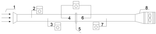 Experimental setup. 1, inlet airflow; 2, flow velocity measurement point; 3, pressure measurement point at the front of the filter material; 4, particle measurement point at the front of the filter material; 5, filter material; 6, particle measurement point at the end of the filter material; 7, pressure measurement point at the end of the filter material; 8, fan.