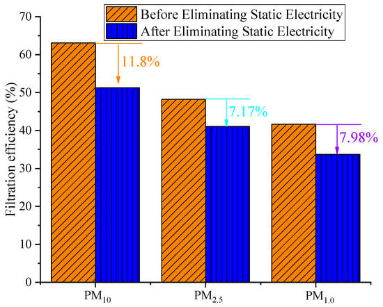 From Figure 3, it can be seen that the filtration efficiency of the reduced graphene oxide air filter material after eliminating static electricity significantly decreased, with the degree of decrease in the order of PM10 > PM1.0 > PM2.5 (11.8%, 7.98%, and 7.17%, respectively). The main reason for this is that, after eliminating static electricity, the charges carried on the fibers are neutralized, resulting in a decrease in surface charge. This indicates that the filtration of fine particles mainly relies on electrostatic effects, while the filtration of large particles relies on other filtration mechanisms such as inertial collision. This conclusion is consistent with the literature [32] and indirectly indicates that adding static electricity to the filter material is beneficial for improving the capture of particulate matter, thereby creating a good indoor environment. At the same time, it also provides a reference for the extension of the same type of materials or the addition of electrostatic function to the new multifunctional composite materials in the future.