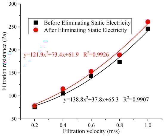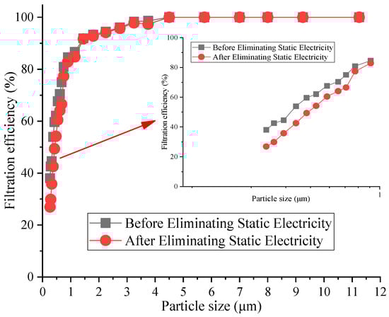 From the figure, it can be seen that the filtration resistance of the reduced graphene oxide air filter material increased with the increase in filtration velocity before and after eliminating static electricity. Within the tested filtration velocity range, the resistance range before eliminating static electricity was 76~246 Pa, while the resistance range after eliminating static electricity was 78.5–261.5 Pa. Thus, the resistance of the reduced graphene oxide air filter material after eliminating static electricity was slightly higher than that before eliminating static electricity (a difference of 2.5~15.5 Pa). The main reason is that soaking the reduced graphene oxide air filter material in an isopropanol solution has a certain impact on the internal micropores. As a result, it causes a certain degree of contraction and binding between fibers, affecting the uniformity of the airflow velocity. The resistance cannot effectively pass through the fibers after colliding under the same air flow, resulting in an increase in its resistance, which is consistent with the conclusions in the literature [23]. Therefore, it is necessary to consider both resistance and filtration efficiency in practical applications.