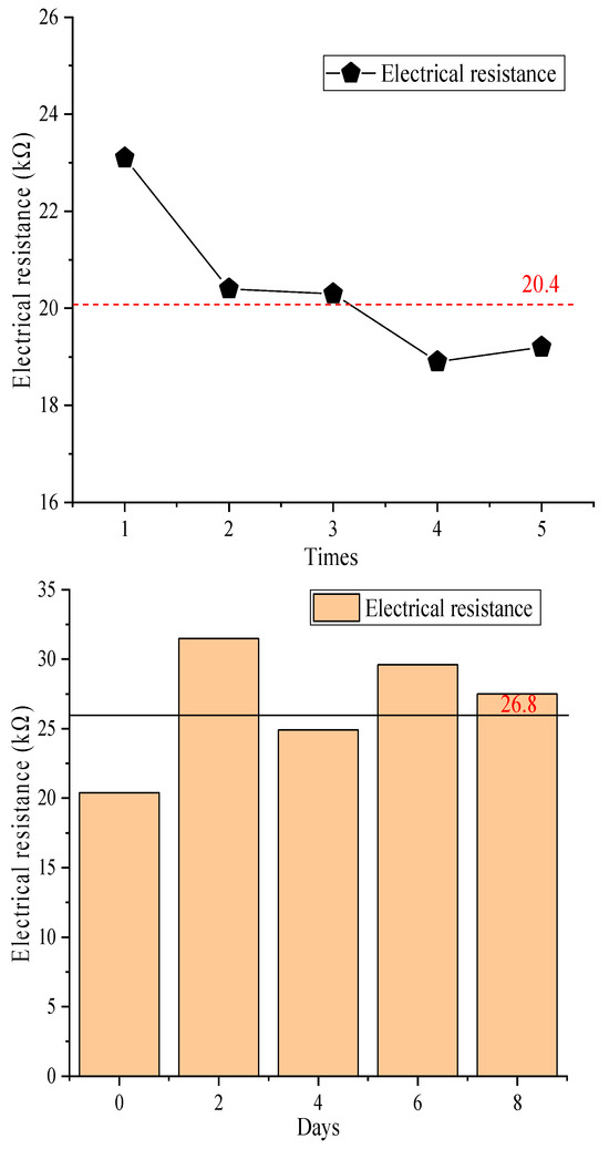 The electric resistance characteristics of the reduced graphene oxide air filter material and its conductivity need to be investigated further. The fiber electric resistance values of the reduced graphene oxide air filter material and the variation in fiber electric resistance values over time are shown in Figure 6.