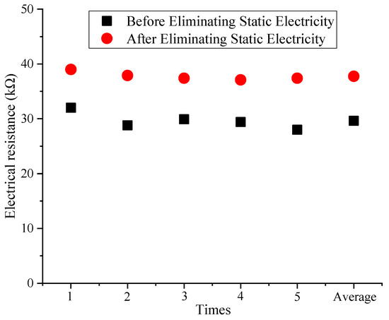Figure 6 shows that the electric resistance value of the reduced graphene oxide air filter material exhibited certain fluctuations after different test durations, which ranged from 18.9 KΩ to 23.1 KΩ, with an average of 20.4 KΩ. These good conductivity characteristics are because reduced graphene oxide is filled between the fibers, completely enveloping them [34], and the electric resistance changes were not significant under the same conditions. Therefore, the reduced graphene oxide air filter material has good conductivity and continuous stability, which also indirectly confirms that adding charges can improve the pollutant capture efficiency of existing composite materials [35]. As the number of days increased, the material still exhibited relatively low electric resistance values and good conductivity, which provides a foundation for the subsequent capture of small particles and expands the application of new reduced graphene oxide air filter materials. The fiber electric resistance of the new reduced graphene oxide air filter material before and after eliminating static electricity is shown in Figure 7.