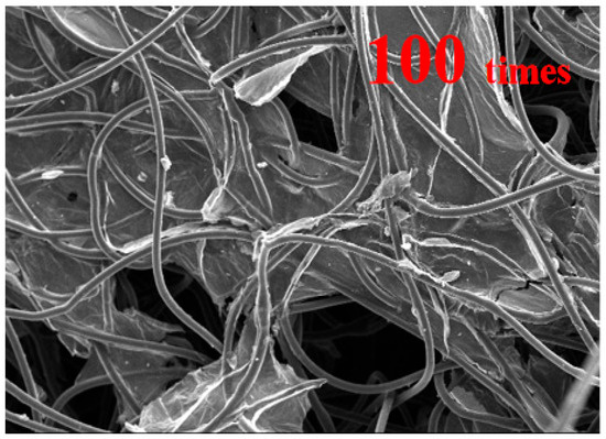 From Figure 7, it can be seen that the electric resistance value after eliminating static electricity was greater than the electric resistance value before eliminating static electricity, with an overall increase of 7.0 KΩ to 9.4 KΩ and an average of 8.1 KΩ. This is because the process of eliminating static electricity has a certain impact on the fiber structure [30], leading to damage to the reduced graphene oxide coating and part of the fiber structure breaking, which makes it difficult to form a complete circuit between the fibers. As a result, based on the above actual situation, the overall increase in fiber surface resistance has been caused. To illustrate the fiber structure of the new reduced graphene oxide air filter material, a scanning electron microscope image is shown in Figure 8.
