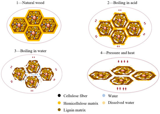 The densification process was based on the method developed by Song et al. [31] and involved two main steps, as in Figure 2. During the first step, wood blocks were boiled in a chemical bath containing a solution of 2.5 M NaOH and 0.4 M Na2SO3 for seven hours, allowing the chemical catalyst to penetrate the cell walls and increase cell volume. This resulted in the destruction of hemicellulose and lignin matrices. Subsequently, the blocks were boiled in deionized water for an hour to remove the catalyst, with the reaction continuing until complete elimination. To ensure thorough chemical removal, the deionized water was changed every 30 min. Water absorption during this step further increased cell volume, creating empty spaces between the cells filled with water. The second step of the densification process involved a thermo-mechanical procedure. The wood blocks were placed in a hot-press for 24 h under a pressure of 3 MPa and 100 °C using a steel mold developed in a previous study [32], to compress and deform the cell walls. This caused the collapse of the cell walls without damaging the fibers, resulting in increased density and strength. Maintaining precise humidity levels was paramount throughout the production of both pine wood and densified pine wood. Typically, wood undergoes conditioning to achieve a moisture content ranging between 12% and 20%. This is done by exposing the wood to controlled humidity and temperature conditions for a certain period of time. For densified pine wood, maintaining moisture content within this specified range was of utmost importance. This ensures that the material preserves its intended strength, flexibility, and dimensional stability. Deviations from these critical moisture levels could cause issues such as warping, cracking, or a decline in mechanical properties, all of which could significantly affect the quality and performance of the final product. The moisture content range of 12% to 20% was chosen based on the expected service conditions of the densified pine wood products, as well as the recommendations from previous studies on wood densification. To further curtail moisture content of densified wood and align it with that of pine wood, a meticulous process was employed. Therefore, densified wood blocks were kept in silica gel (with a diameter of 2–5 mm with moisture indicator changing the color), maintained at a temperature of 70 °C for a duration of 48 h. This method harmonized the moisture content, enhancing both durability and resistance to chemical reactions.
