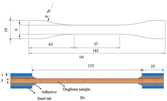 To assess the strength along the fiber direction, dogbone-shaped samples were manufactured for both natural pine wood and densified wood, as shown in Figure 3a. Reduced scale specimens were used due to the geometric restrictions of the densified wood block. These specimens were validated against standard specimens of pine wood, comparing with the standard specimen results of Moura et al. [15]. To prevent sample failure at the grips, 1 mm thick steel tabs were bonded to both ends of the samples. Adhesive fillets were also applied to ensure a more uniform stress transfer to the gage length of the specimens; as depicted in Figure 3b, five specimens were tested.