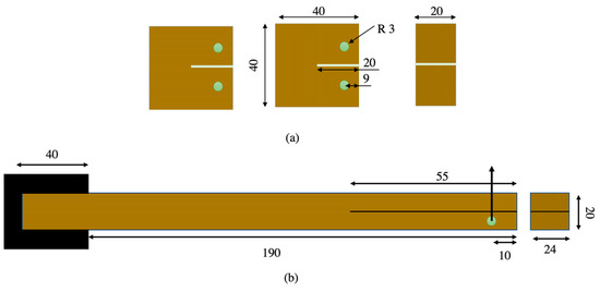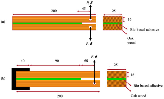 Thick adherend shear test (TAST) specimen geometries with the wood loaded in the transverse (a) and fiber direction (b). (Dimensions in mm).
