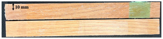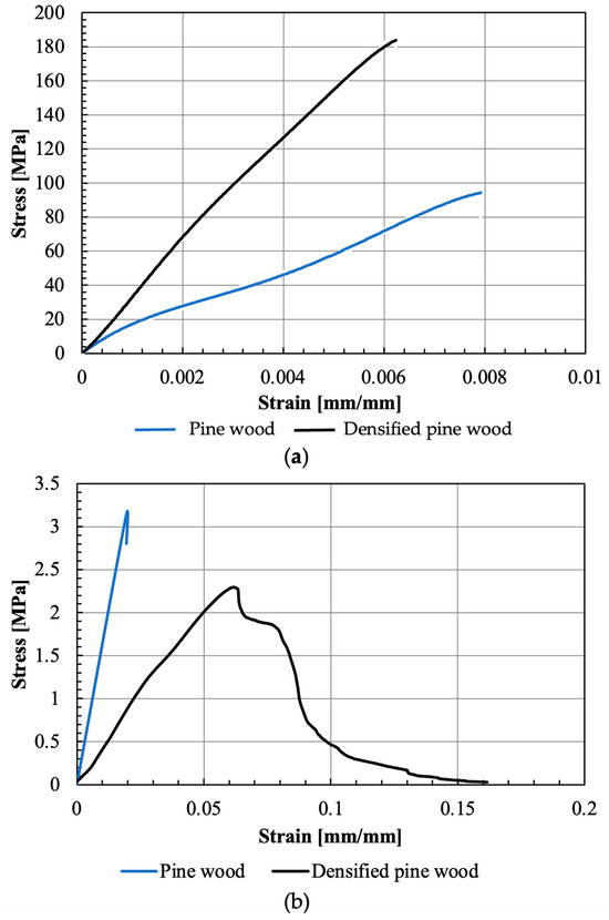 Figure 10 illustrates a representative stress–strain curve obtained from the manufactured samples of both pine wood and densified pine wood for strength properties. The determined values of Young’s modulus and strength in the fiber and transverse direction can be seen in Table 2.