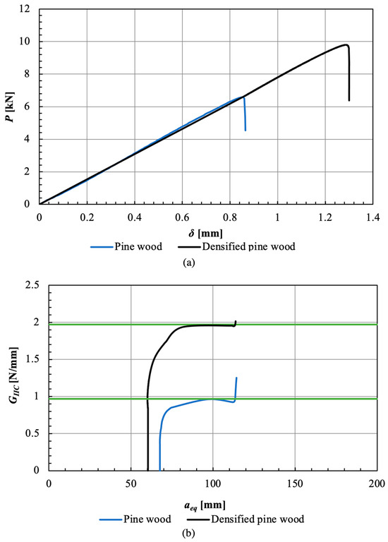 Mode II fracture energy of densified wood was measured by testing ELS specimens, with CBBM being used to generate an R-curve from a P-δ curve. The average mode II fracture energy of pine wood and densified pine wood was about 0.9 ± 0.1 N/mm, and 1.7 ± 0.2 N/mm, respectively. Typical behavior of ELS specimens is shown in the P-δ curve ELS in Figure 12a and the obtained R-curve is presented in Figure 12b.