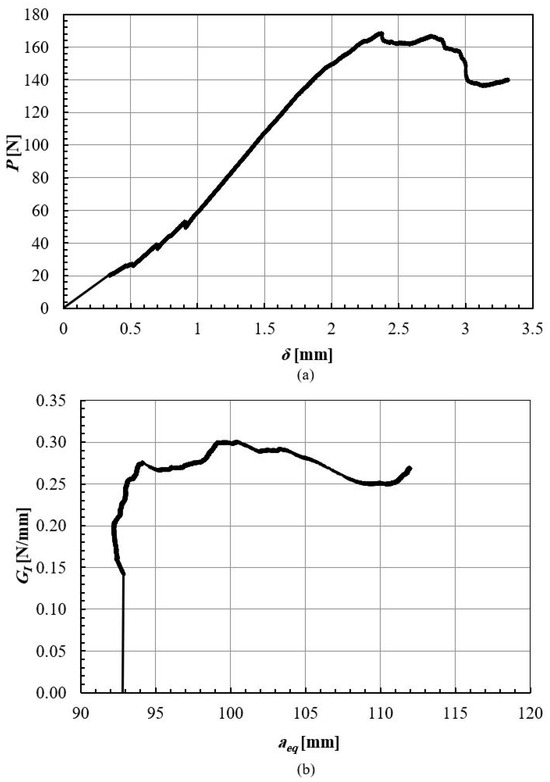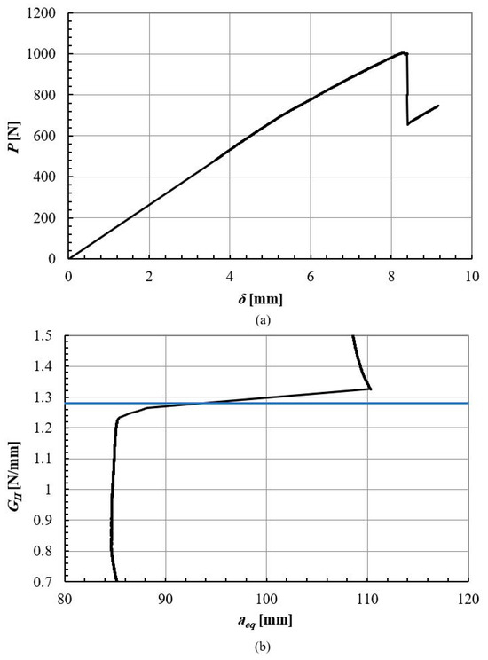 The same procedure was conducted for mode II from the P-δ curve of the ELS test, shown in Figure 17a, and through applying CBBM and obtaining the R-curve, shown in Figure 17b. The average mode II fracture energy was determined to be 1.2 ± 0.2 N/mm.