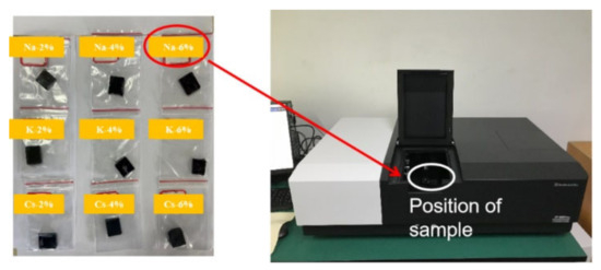 In recent years, new nanoscale MxWO3 materials have been widely used in the fields of construction materials and insulating glass [21]. Local surface plasmon resonance [22] and small-polaron absorption [23] have resulted in good near-infrared thermal shielding properties, wherein infrared radiation was absorbed from 700 to 2500 nm, which is an ideal thermal shielding material [24] and has already demonstrated its excellent cooling performance [25,26]. Therefore, in this study, we exploit the use of nano-MxWO3 for road engineering as a novel functional material for the development of a “thermal shielding” coating. The coatings were tested using a UV/VIS/NIR spectrophotometer (PerkinElmer Lambda 950) to evaluate the effect of different cations (M = Na, K, Cs) and doping levels (2%, 4%, and 6%) of MxWO3 on the optical properties of the road coatings to achieve excellent near-infrared light-shielding and to test their thermal insulation effect under actual outdoor solar radiation conditions.