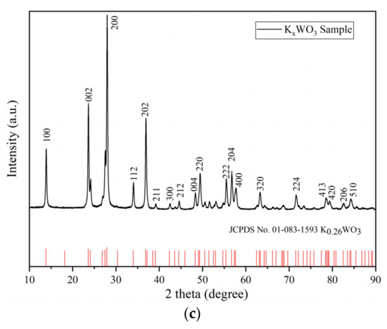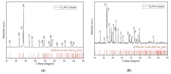 XRD measurements were employed to evaluate the purity and crystallisation of the MxWO3 (M = K, Na, Cs) material used in this study. The XRD spectrum of MxWO3 is displayed in Figure 6, along with the corresponding standard XRD patterns and their JCPDS numbers at the bottom of each figure. The samples that best match the overall diffraction peaks with KxWO3, NaxWO3, and CsxWO3 are the hexagonal K0.26WO3 (JCPDS NO. 01-083-1593), tetragonal Na0.26WO3 (JCPDS NO. 01-081-0895), and phase Cs0.3WO3 (JCPDS NO. 01-081-1244) standard reference materials, respectively.