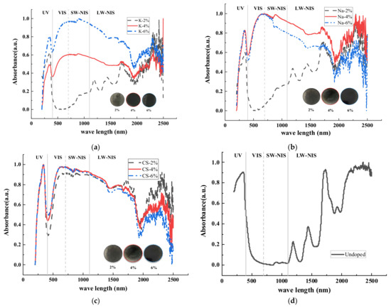 The absorbance spectra of the road coatings containing MxWO3 in the wavelength range of 200–2500 nm are shown in Figure 8 (normalized results). Figure 8a–c show the absorbance spectra of MxWO3 at doping levels of 2, 4, and 6% and Figure 8d shows the absorbance spectra of undoped coating, respectively. Figure 8 indicates that the type and concentration of MxWO3 affect the absorbance spectra of the coatings directly; a higher doping level contributes to improved NIR shielding. The NIR shielding of the road coatings using CsxWO3 was excellent and similar at concentrations of 2, 4, and 6%.