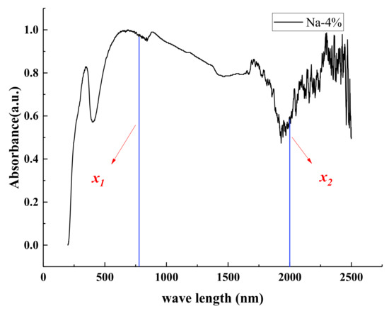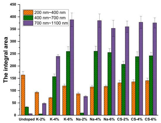 To further quantify the effects of different MxWO3 materials and the concentration on the near-infrared thermal shielding properties of the coatings, the absorbance spectral curves were integrated using Na-4% as an example (Figure 9), and the absorbance values of the coating in the infrared region ranging from nm to nm were integrated according to Equation (2). Figure 10 shows a summary of the integrated area of the coating in the 200–400 nm, 400–700 nm, and 700–1100 nm regions.