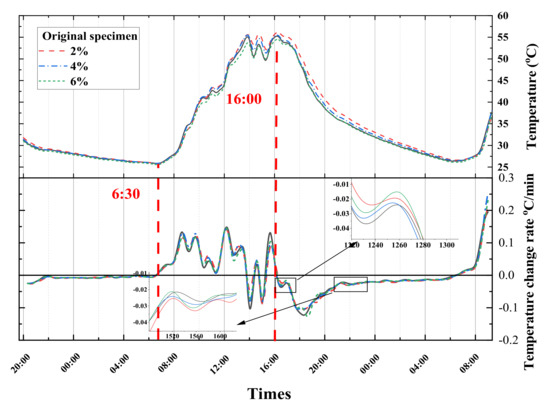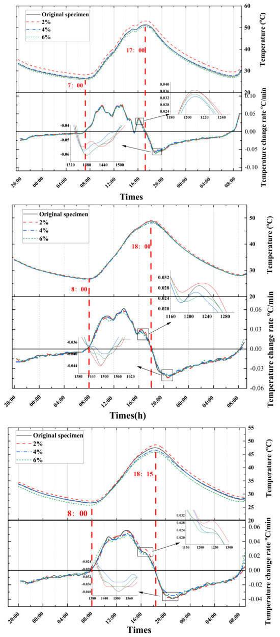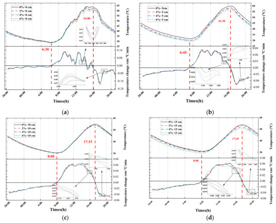 Temperature and temperature rate–time variation curves for different depths at 0, 2, 4, and 6% doping levels (30 June 2021). (a) Surface temperature profile of the specimen; (b) Temperature profile at P5; (c) Temperature profile at P10; (d) Temperature profile at P15.