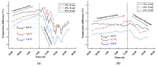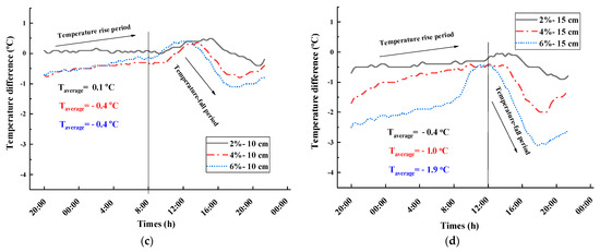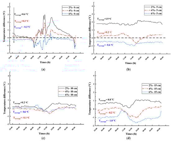 - Considering Cs-2% as an example, the average values of the temperature difference at P0, P5, P10, and P15 are −0.5, −1.5, 0.1, and −0.4 °C, respectively, and the maximum values of the temperature difference were −3.1, −2.0, −0.4, and −0.9 °C, respectively. The most significant thermal insulation effect occurs at P5.