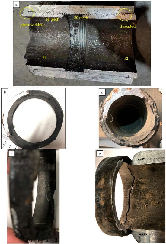 The circumferential crack is located near the girth weld of the #1 tubing; the inner surface of the coupling joint is covered with black oil; and there is no obvious corrosion on the coupling and the #1 and #2 tubing. From the cross-section view, there are 20 teeth in total for the #2 male thread tubing, and about 14 teeth for the #1 male thread tubing. Therefore, it can be inferred that the male thread end of the #1 tubing has not been threaded to the specified position. The surface of the fracture is covered with black matter (Figure 2b,c). Observed from the side view, there is no obvious plastic deformation at the crack of the #1 tubing.