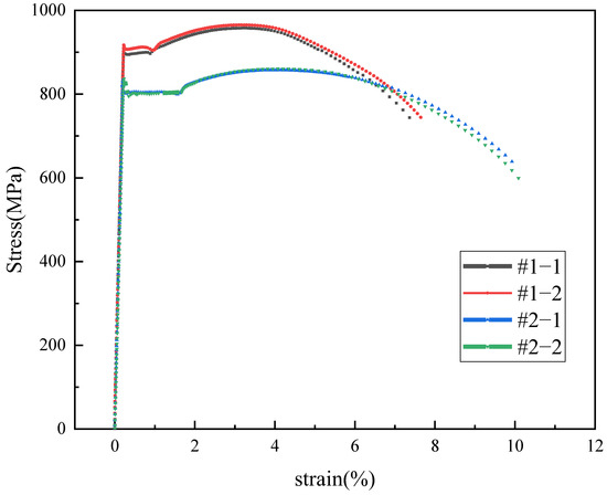 The results of the tensile test are shown in Table 2, and the strain–stress curves are shown in Figure 3. The tensile strength and yield strength of the #1 repaired tubing meet the requirements of the standard API 5CT for P110, and the tensile strength and yield strength of the #2 repaired tubing meet the requirements of the standard API 5CT for C110.