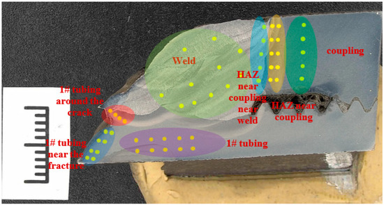 The microhardness of the longitudinal section of the crack region was tested with a DuraScan 70G5 micro-Vickers hardness tester (Emcotest, Kuchl, Austria) according to the ASTM E384-17 standard (Figure 5). The results are shown in Table 5. The hardness of the coupling is between 279 and 334 HV10, and the local hardness of the heat-affected zone of the coupling increases, reaching a maximum of 391 HV10. The hardness of the welding zone is lower than that of the coupling and the tubing, which is about 220 HV10. The hardness of the #1 tubing is about 320 HV10. At the crack of the welding toe of the #1 tubing, the hardness value reaches 476 HV10.