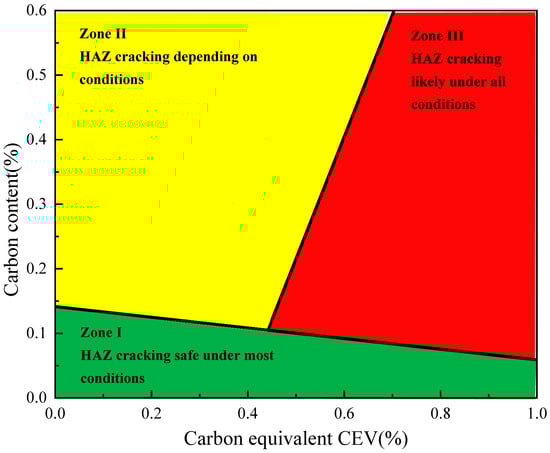 The International Institute of Welding (IIW) uses carbon equivalent value (CEV) [13,14] to evaluate weldability. When CE ≤ 0.45%, the weldability is good; when CEV = 0.45~0.5%, the weldability is slightly poor, and proper preheating is required before welding; when CE ≥ 0.5%, the weldability is poor, and it is a difficult-to-weld material, and a higher preheating temperature and strict welding process are required.
