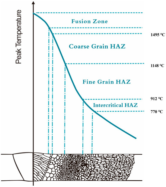 The welding thermal simulation involves controlling the peak temperature and cooling rate to replicate the welding thermal cycle process in different heat-affected zones. Based on the peak temperature profiles of different welding regions in carbon steel as shown in Figure 11 [20], we designed heating and subsequent air-cooling processes to simulate the thermal cycles in different welding locations. We selected five peak temperatures: 850 °C, 950 °C, 1050 °C, 1100 °C, and 1200 °C. The 1200 °C temperature represents the coarse-grain heat-affected zone, while 1100 °C, 1050 °C, and 950 °C represent the fine-grain heat-affected zone, and 850 °C represents the intercritical heat-affected zone.
