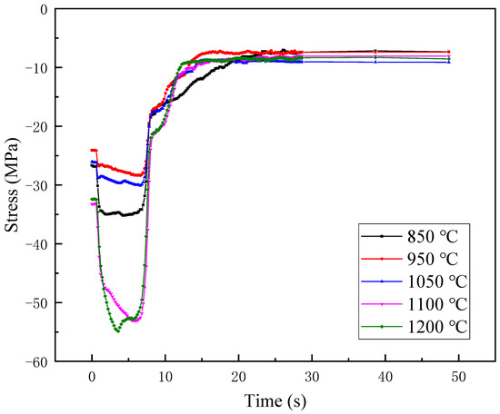 The thermal simulation test was conducted on the #1 tubing to verify the microstructure of the weld. The two ends of the sample were clamped and were heated to 850 °C, 950 °C, 1050 °C, 1100 °C, and 1200 °C in 10 s intervals, respectively, and then air cooled. The load was recorded during the heating test, and the microstructure and hardness were inspected after the test. Figure 12 shows the load variation when heated to different simulated peak temperatures. The sample is first thermally expanded, and since the two ends are constrained, the sample is subjected to compressive stress, which continues to increase. When air-cooled, the sample shrinks; the sample is subjected to tensile stress; and the load rises in reverse. When heated to 1100 °C and 1200 °C, the maximum compressive stress reaches 55 MPa. After cooling, the maximum stress variation is about 45 MPa.