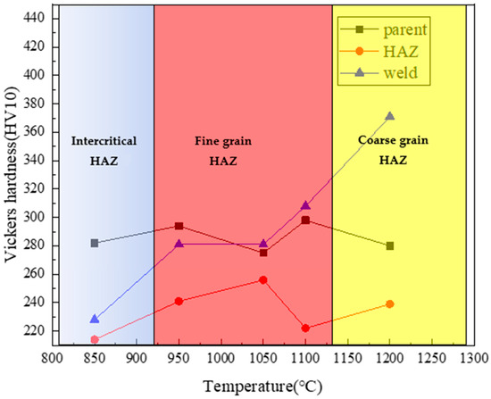 Microhardness value of thermally simulated samples at different peak temperatures.