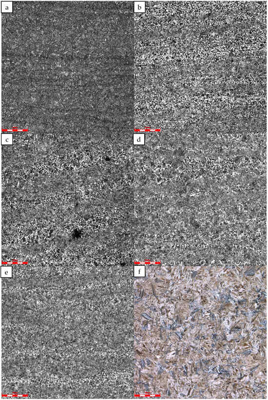 Optical microstructure of #1 repaired tubing base material at different simulated peak temperatures: (a) base material, (b) 850 °C, (c) 950 °C, (d) 1050 °C, (e) 1100 °C, and (f) 1200 °C.