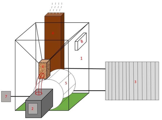 A simplified scheme of a test stand for combustion of biomass pellets, where 1—main boiler chamber; 2—burner; 3—heat exchanger; 4—funnel; 5—combustion chamber; 6—fuel feeder; 7—flue gas analyzer; 8—control panel.